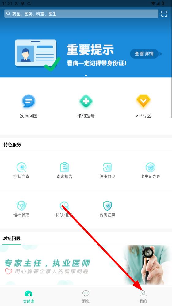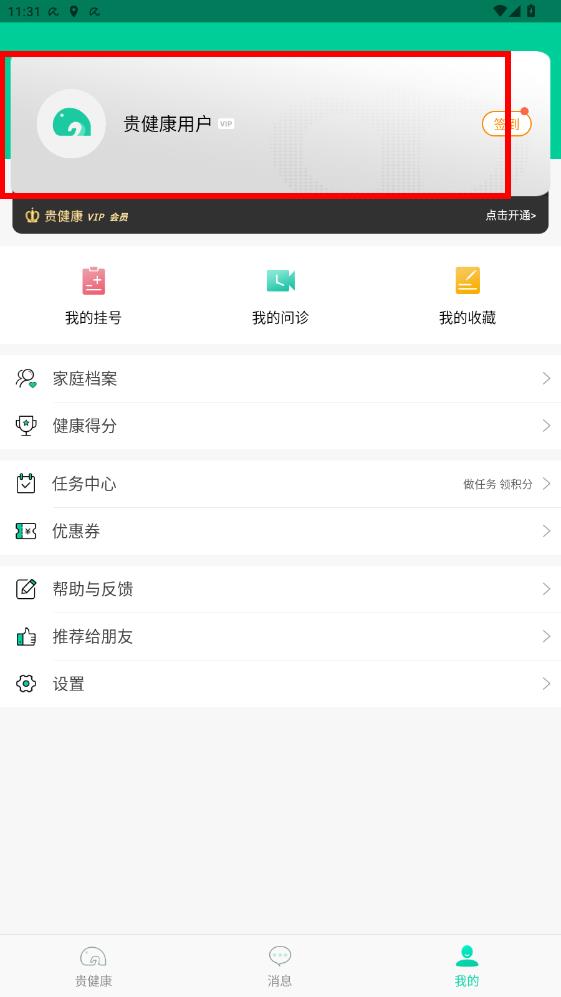 1、在贵健康app首页,点击右下角我的选项,进入个人中心界面。
