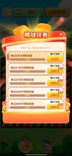 2、任务系统:每个关卡设定了不同的任务要求,玩家需要根据任务指引完成特定目标,可能是消除一定数量的方块,或者收集特定类型的资源。成功完成任务后,可以获得丰厚的奖励,激励玩家继续前进。
