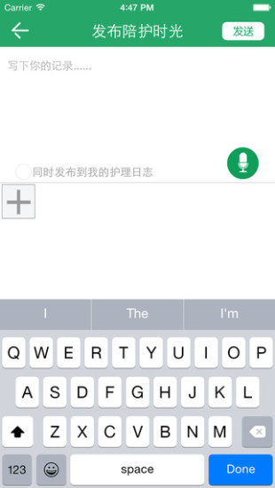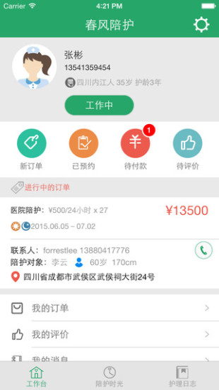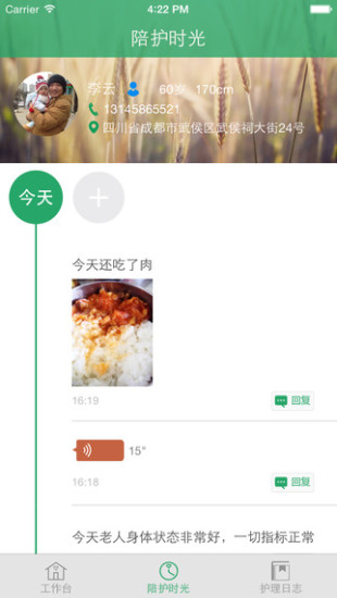 3.在春风陪护的陪护时光板块中,陪护师可以通过APP创建健康档案,上传陪护过程语音、图片、文字等,亲人远在千里,也可以随时了解、跟进康复进展、生活细节等。与传统O2O模式不同的是,春风陪护的服务时间更长,是一个相对长期的过程,更看重的是陪护师与用户24小时的一个粘性。陪护过程中,陪护师更容易和老人建立起情感的联系,用户粘性更高。