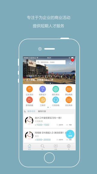 公关活动、影相拍摄、创意设计、工程师、娱乐演出、行政协助、舞台角色、体验师、写作翻译等行业,致力于为自由职业者提供一个安全可靠的高质量项目平台。