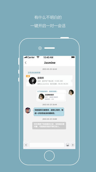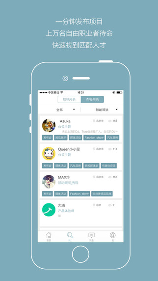 2.自由职业者可自动申请项目,项目主可主动邀请自由职业者参与,实时对话,双方一对一约谈。