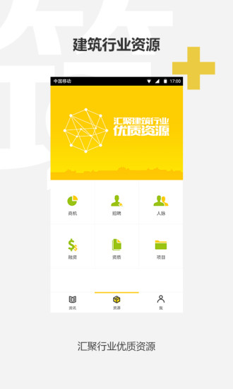 1.云筑加资源立足建筑行业,从不同的资源维度出发,建立起初级资源与高级资源,初级资源有商机资源、招聘资源、建筑业资质等。
