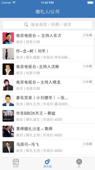 在婚庆圈界面,朋友、同行、婚庆公司都可以快速的找到,点击搜索—输入条件—加入收藏,同样只需要三个步骤,就可以随时随地和好友沟通。