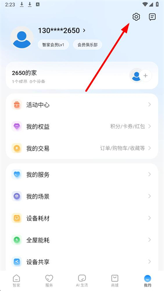 1、进入海尔智家应用后,在个人页面点击右上角的设置选项,进入设置操作界面。
