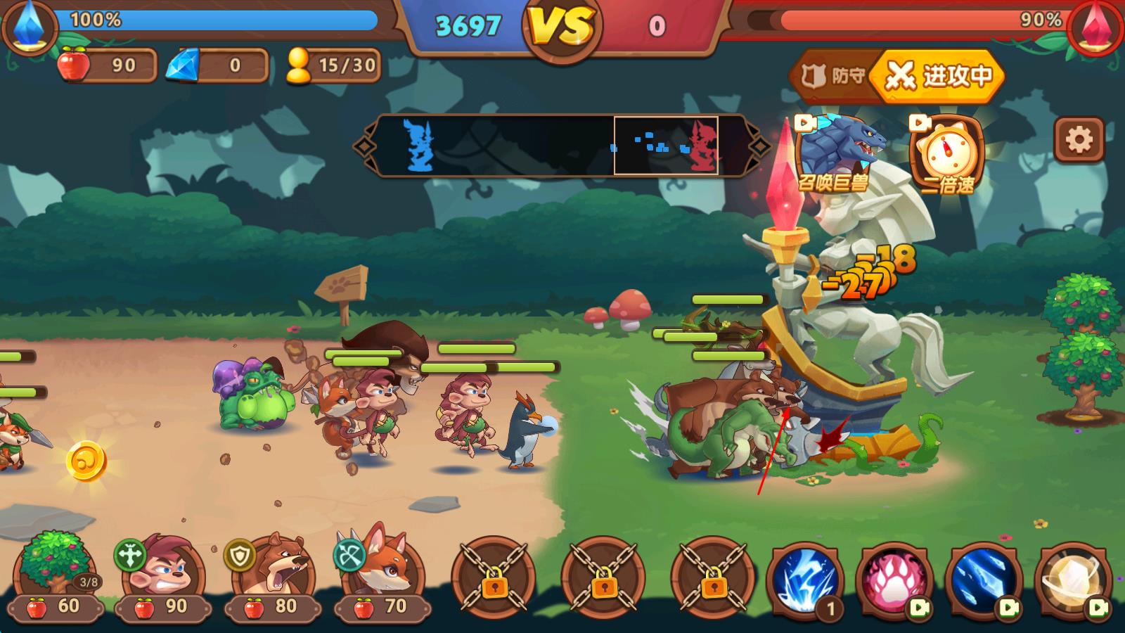 3、面对巨型首领战时,提前收集并激活隐藏神器,搭配克制首领的动物兵团,制定攻防策略,在限时挑战中击溃首领,解锁未知新大陆,推进森林保卫进程。