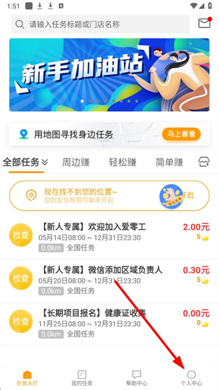 1、在爱零工应用底部,点击个人中心,进入个人中心页面。