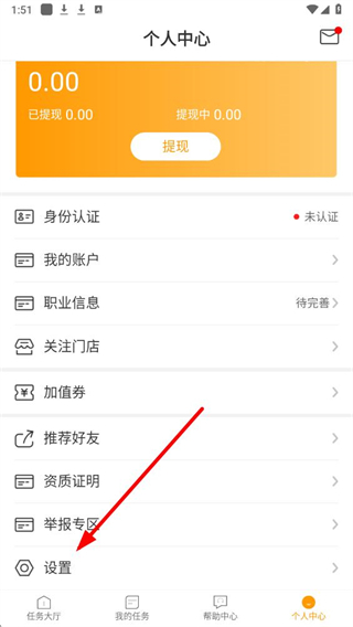 2、在个人中心页面中,找到设置选项并点击,进入设置操作界面。