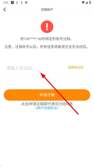 4、在注销账户页面,获取并输入验证码,点击申请注销按钮,即可提交账号注销申请。
