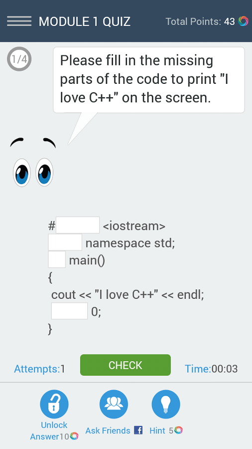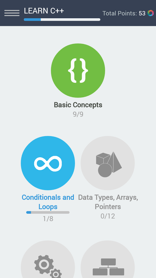 学习C++中包括了60节课程并分为8大章节,分别包含基本概念、数据类型、数组、指针、条件语句、循环、函数、类和对象、继承与多态、模板、异常和文件。解锁新的章节,完成题目,得到分数,并与世界各地的学习者比较成绩。最重要的是,在乐趣中学习要比死记硬背更加有效率。