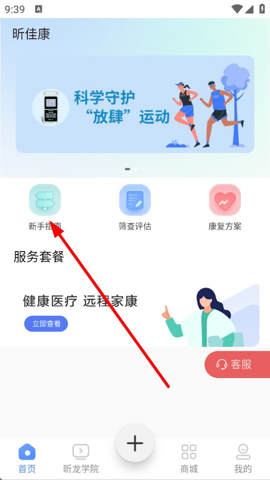 1、打开昕佳康APP,在首页功能区找到并点击「新手指南」图标,进入新手指南界面。
