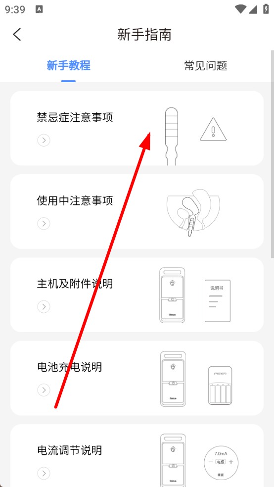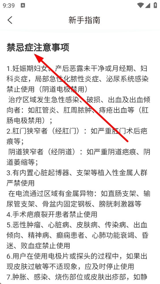 2、在新手指南页面,默认显示「新手教程」标签,选择需查看的指南条目,如禁忌症注意事项。