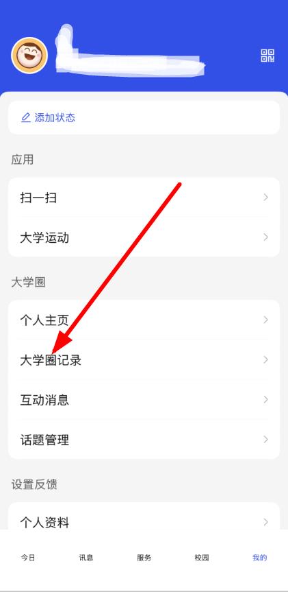 2、在个人界面,找到并点击大学圈记录选项,进入记录页面。
