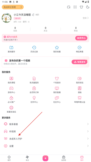 2、进入个人主页内,在更多服务下点击未成年人守护。