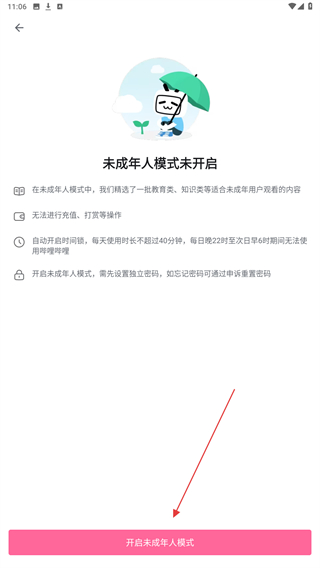 4、了解未成年人的模式后,点击开启的按钮即可。