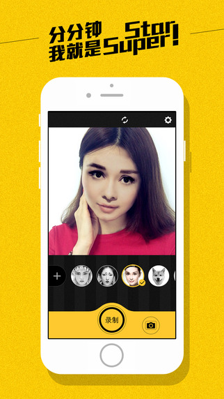 1.使用前置摄像头贴合在用户自己的脸上,实时演绎。可以点击拍照分享,或者录制20秒视频分享。