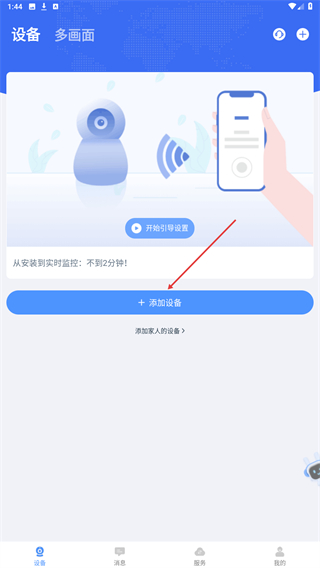 1、在设备多画面页面,点击+添加设备,进入设备添加的向导流程页面。