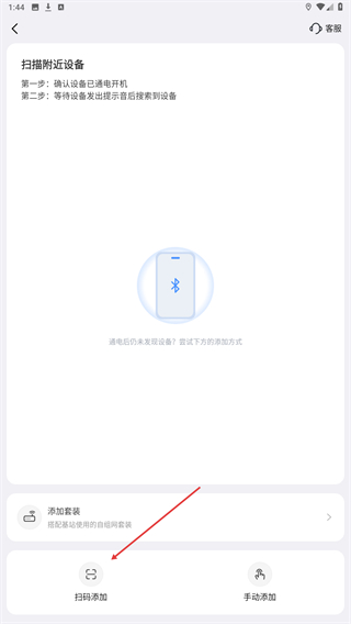 2、在扫描附近设备的页面,点击扫码添加选项,切换至扫描设备二维码的添加页面。