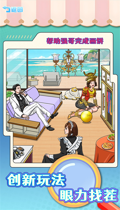 1、场景找茬操作:进入游戏后,玩家在给定的场景中仔细观察图片,找出隐藏的私房钱以及其他不同之处,并且标记出来。