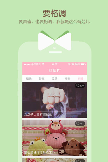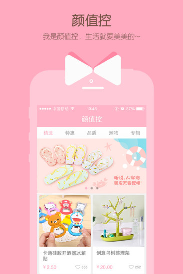“颜值控”是以饰品、家居为主的美物导购平台.拥有专业时尚的买手团队,每天24小时不间断为亲搜罗一切美好的小物,让你轻松选颜值,放心购品质,还有售后保障哦^^所以亲们再也不用去网上苦苦搜索一件满意的家居饰品,赶快下载颜值控吧,保证每一件商品颜值都棒棒哒!颜值控,最In 最Nice最Top的全都在这儿,汇聚美优品类、汇聚划算商品,是你口袋购物的最佳选择,每天让买手告诉你什么值得买,什么最优惠,什么最时尚,一起把美丽说出来!