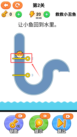 4、通过合理抽取场景中的别针,规划最佳解救路线,最终帮助小鱼安全返回水域。