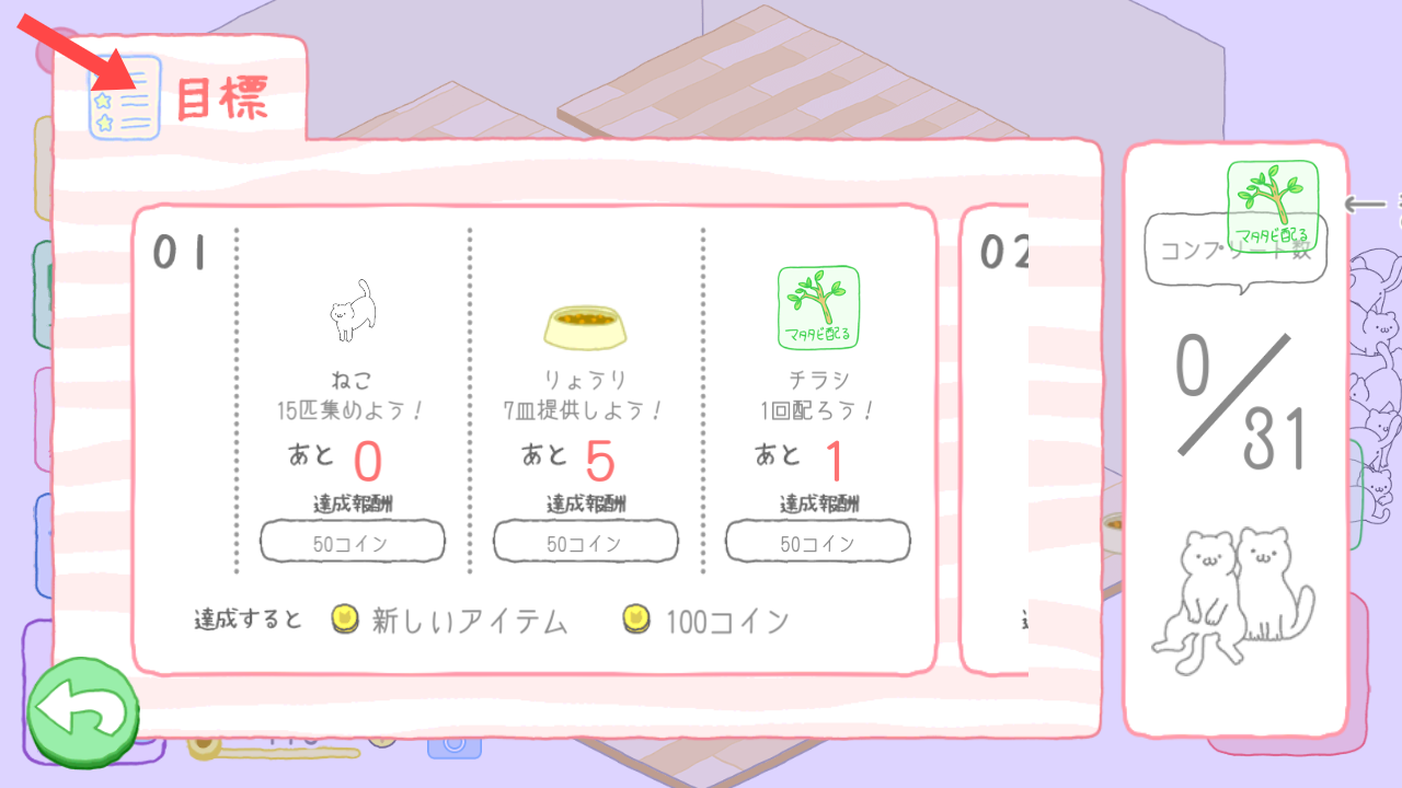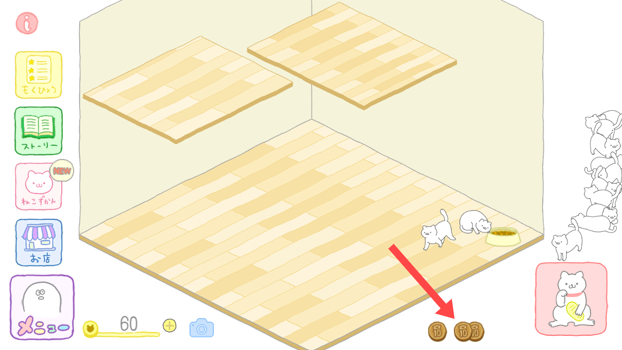 2、收集金币购买道具:猫咪会给予你金钱,通过收集这些金币,前往商店购买各类道具,根据猫咪喜好与需求。