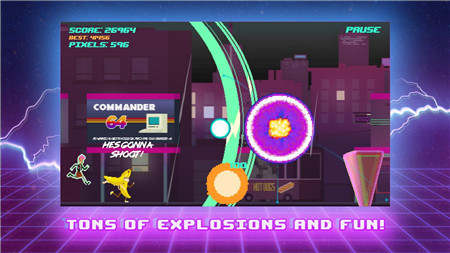 1、操控角色穿梭街道:通过左侧滑动屏幕操控凯文进行跳跃或下滑,躲避街道上的陷阱、障碍物;右侧点击屏幕释放子弹,击退来袭敌人。