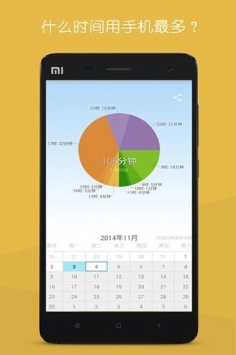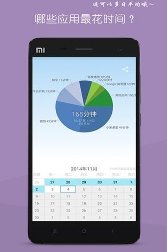 时间都去哪儿了?玩儿手机消耗了我们每天太多时间,抬起头看看这世界,你会发现值得关注的还有更多。这个小应用帮你记录每天使用手机的时间,超过设定时间屏幕上的蓝天会变成雾霾,记录了最近30天目标完成情况,绿色树叶表示当天达成目标,黄色树叶表示未达成,向右滑动屏幕查看详细数据。