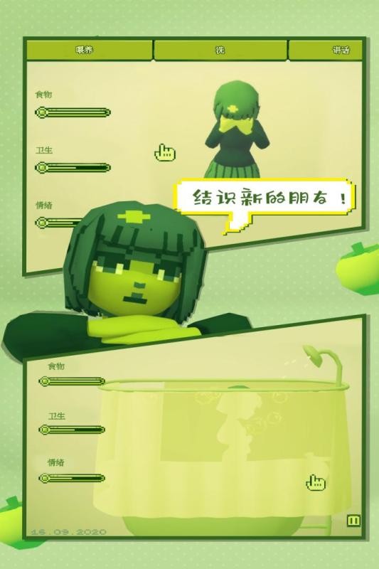 2、多样互动体验:能与女孩进行喂食、洗澡、交谈等丰富互动,关注食物、卫生、心情三方面元素,每次选择皆影响女孩状态。
