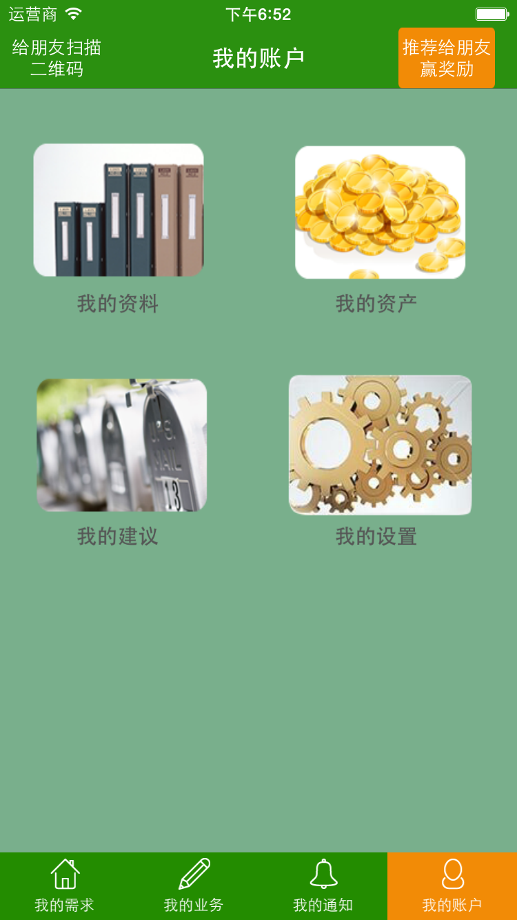 我的账户,资料管理,资产管理,意见反馈和对软件进行设置