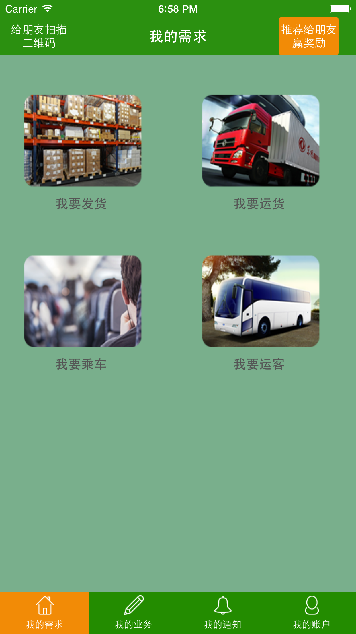 我的需求,货主可以在此发布货运需求,货车司机可以发布运货需求,乘客可以发布乘车需求等,只要你有需求,不论你是货主、乘客还是司机