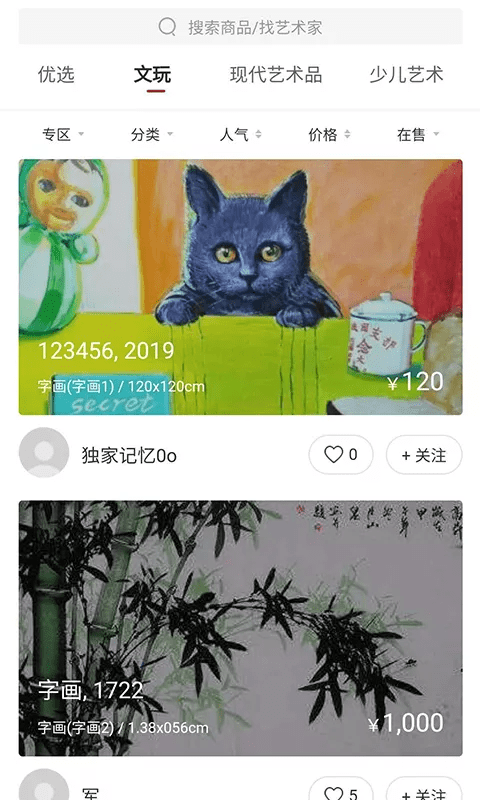 艺交在线APP是一款专门给喜爱艺术的人提供艺术交流的平台,平台上有非常多的作品展示,您能够根据自己的喜好去查看这些作品,每个作品都有售卖的金额,您可以搜索商品,或者寻找艺术家。