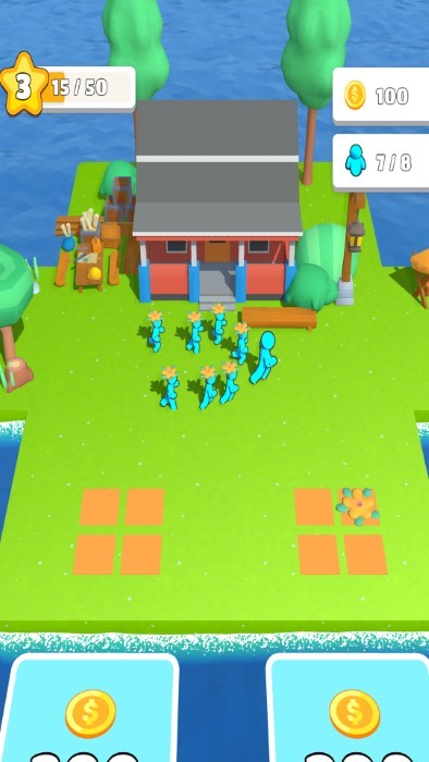 1、农场种植发展:不断开发土地,扩大农场区域,在土地上种植作物,收获火柴人,提升队伍规模。
