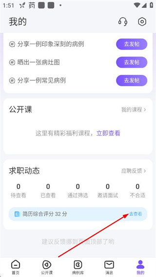 2、在我的页面,点击简历综合评分右侧的去查看,进入我的简历页面。