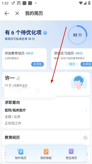 3、在我的简历页面,点击需要修改的信息区域,即可编辑并修改简历内容。