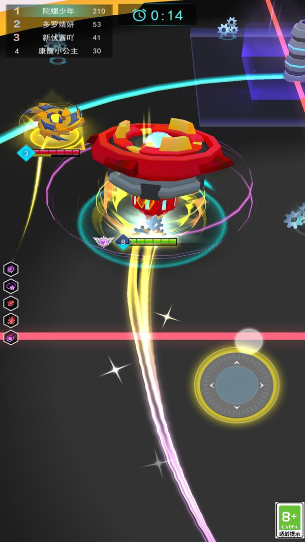 2、真实物理碰撞:依托高精度物理引擎,细致模拟陀螺旋转轨迹碰撞角度与力量传导,每次对战都需精准预判对手动向,利用物理特性制定战术,感受真实对战的策略深度。