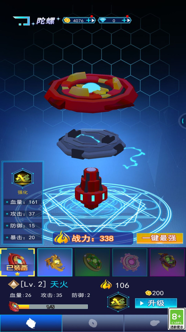 1、部件收集组装:通过完成关卡挑战参与竞技对战等方式收集各类陀螺部件,在组装界面自由搭配不同部件,调整陀螺的攻击防御速度等属性,打造适合自己战斗风格的强力陀螺。