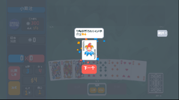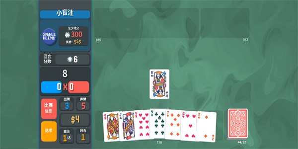 1、牌局核心流程操作:每回合抽取手牌通过弃留组合牌型,系统根据牌型与小丑牌加成计算得分,目标是在有限回合内累计分数击败不断提高的盲注。