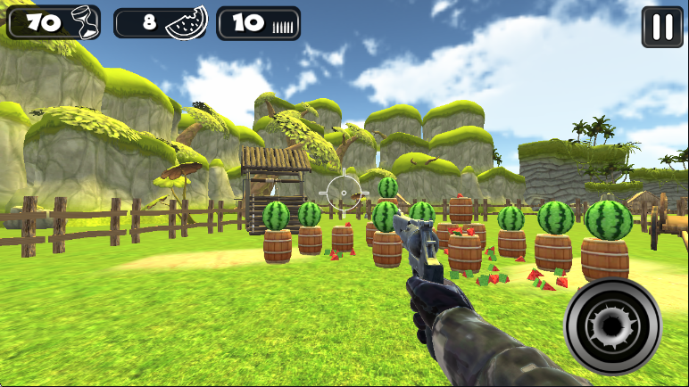 1、摇杆精准操控:通过虚拟摇杆灵活调整射击角度与力度,瞄准不同位置的西瓜进行射击,利用枪械特性与操作技巧实现快速连击,提升单位时间内的爆瓜效率。