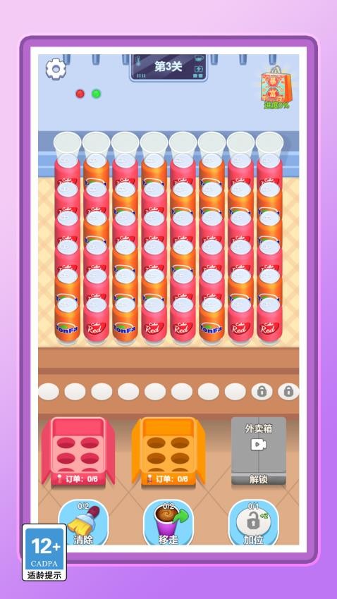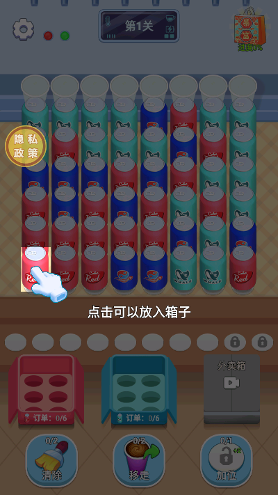 1、分类包装玩法:以订单为导向的分类任务为核心,玩家需从仓库中精准找出相同包装的饮料罐,按要求数量放入纸箱。