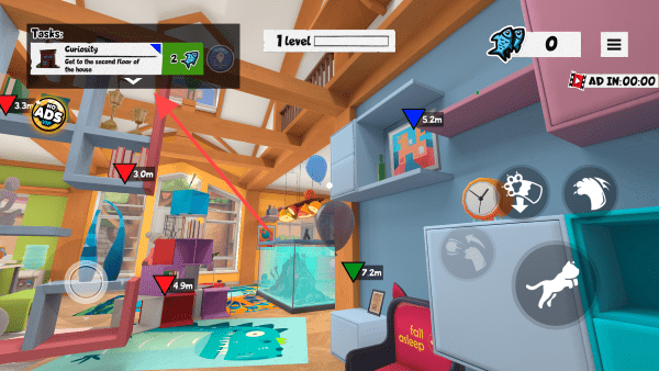 3、任务驱动探索:含主线(偷三文鱼)、支线(3分钟内制造5处混乱)及隐藏任务(找猫薄荷),完成获取小鱼干解锁“招财猫”等皮肤或激光笔等道具。