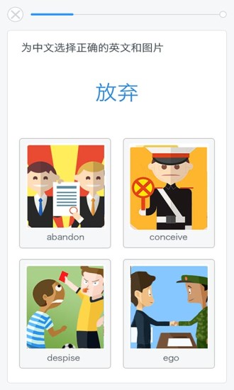 多题型“闯关”背单词:通过各种题型来背单词,不只帮你认识“它”还让你会使用“它”,中英4选1、图背单词、拼写练习、单词连连看一切只为了你能快速掌握。
