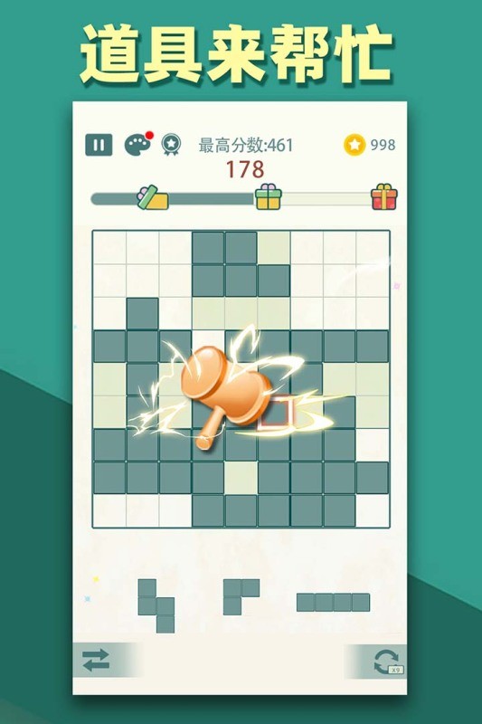 1、在九宫格中摆放方块消除得分。