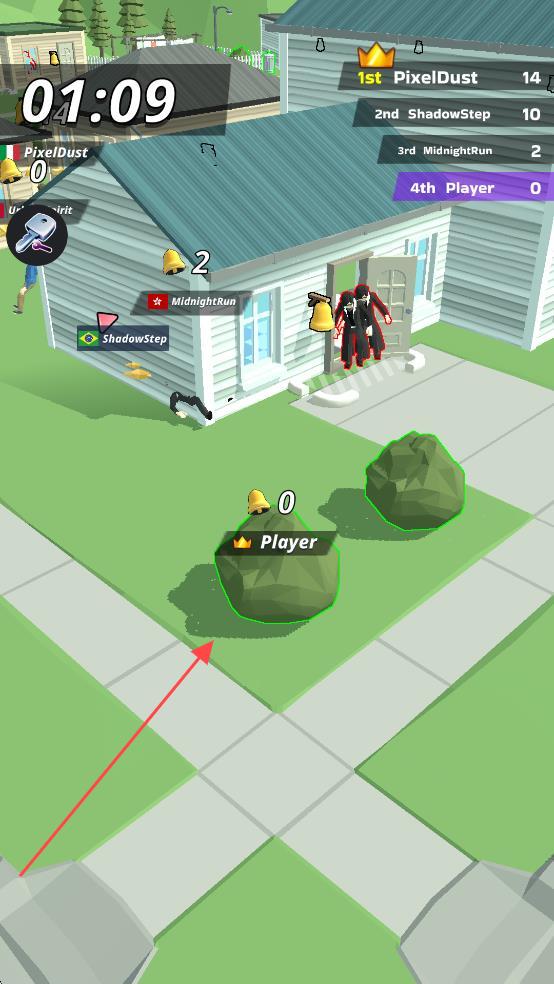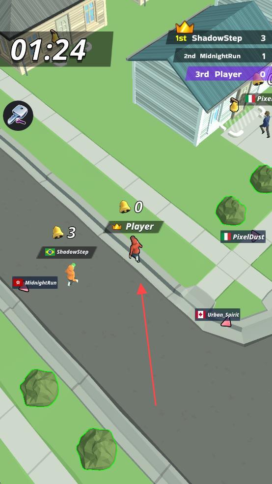 1、操作技巧:短按门铃快速触发后立即躲入最近掩体,滑动屏幕时注意路线上的道具拾取,长按可冲刺摆脱近距离追捕。