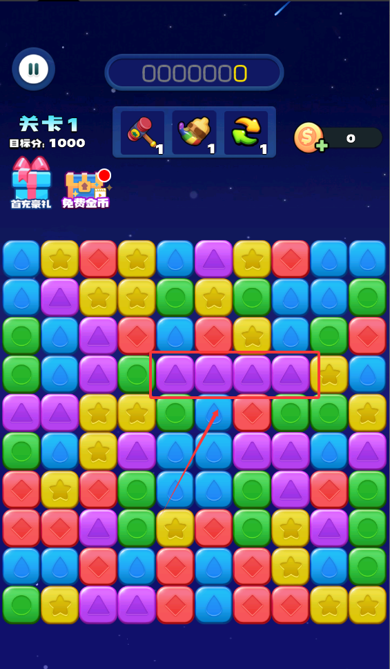 2、相邻两个同样的星星可以消除,获取分数。