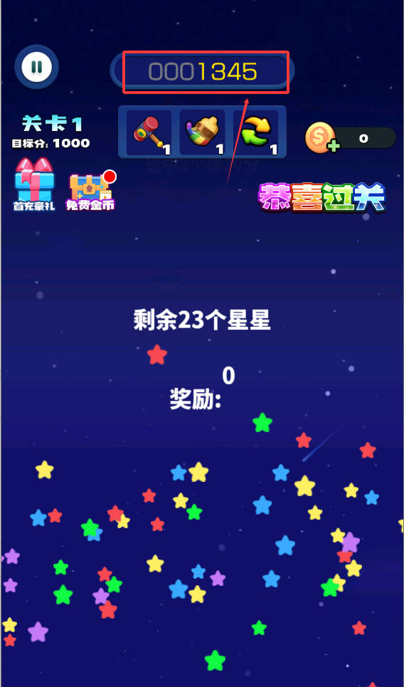 4、高分技巧,观察方块排列规律,规划最佳消除路线,一次性消除越多星星分数加成越高。