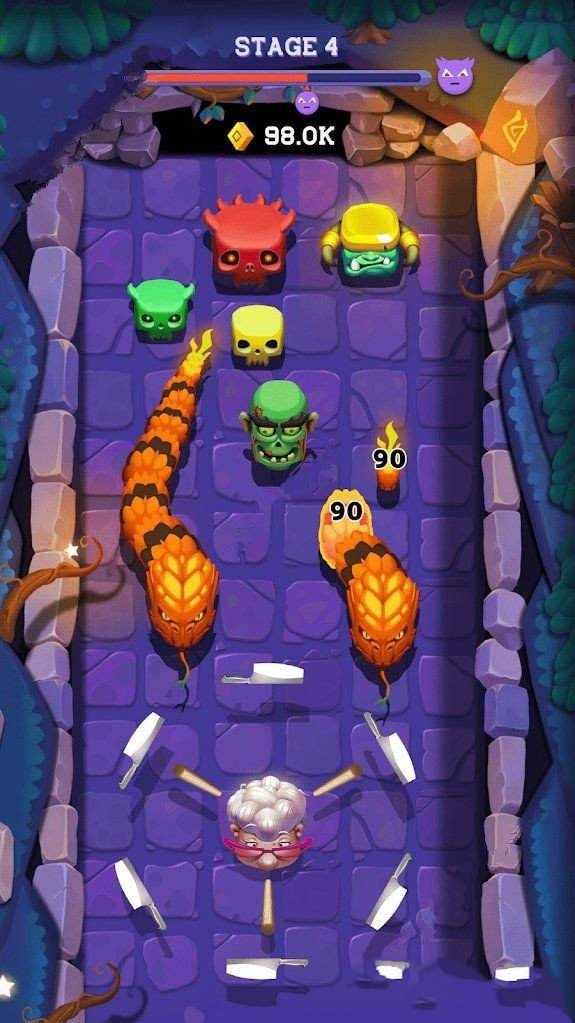 1、操控奶奶战斗:通过简单的触屏操作控制老奶奶移动与攻击,灵活躲避怪物攻击并释放强力技能,体验流畅的即时战斗操作。