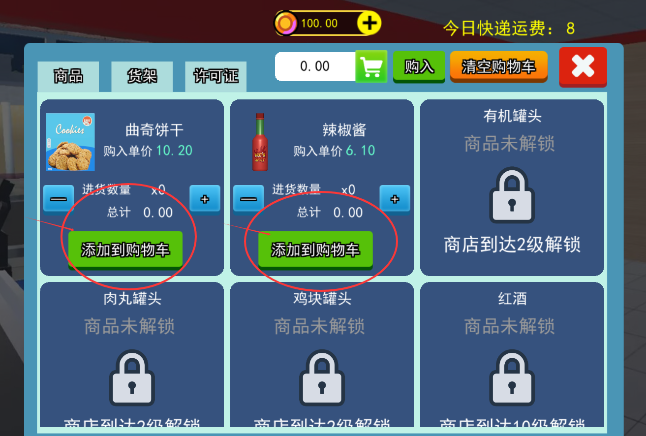 2、设定合理的进货商品及数量,类型包括了曲奇饼干、辣椒酱等。