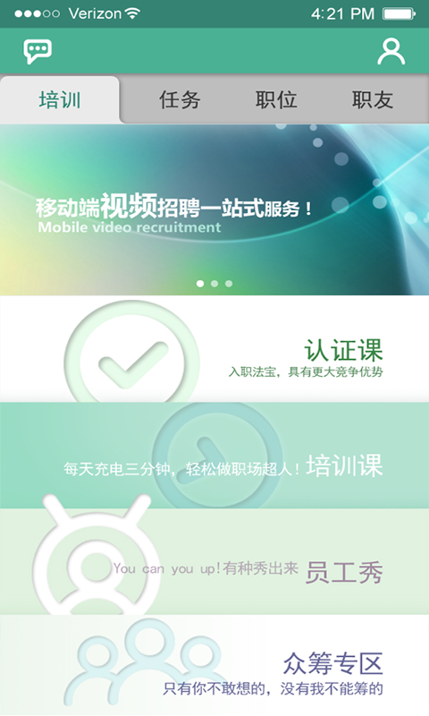 维客轻应用app是一款提供移动端视频招聘一站式服务的手机软件,软件提供职业培训和入职法宝,还给员工提供秀出来的平台,需要的赶快下载体验吧!