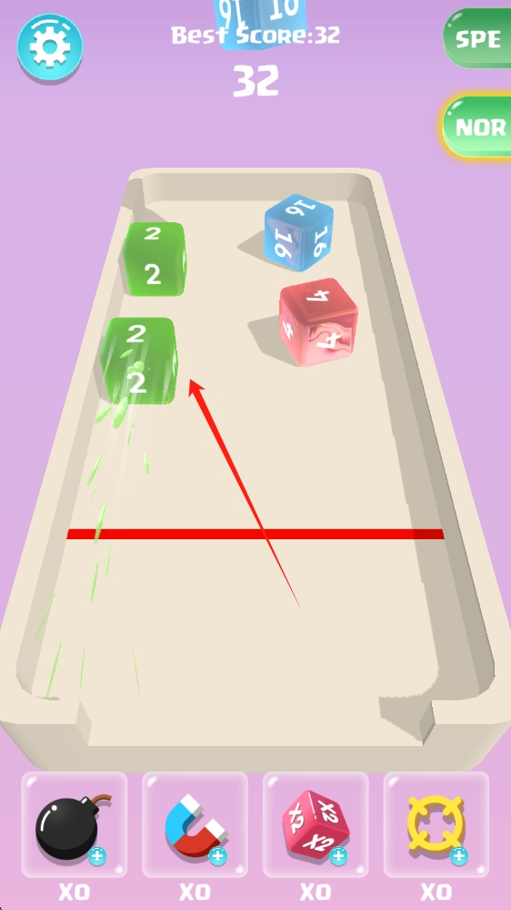 2、精准瞄准合并:仔细观察场景,精准瞄准与发射方块颜色、数字相同的立方体,实现相撞合并操作。