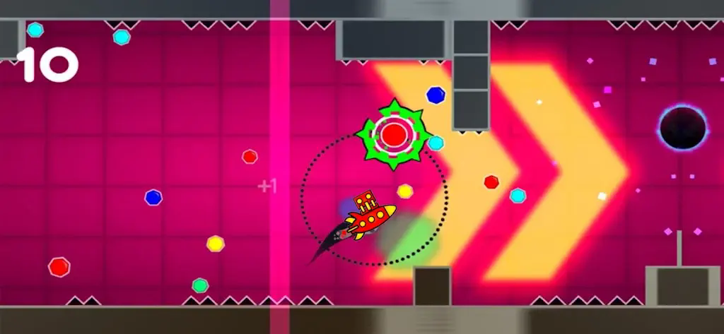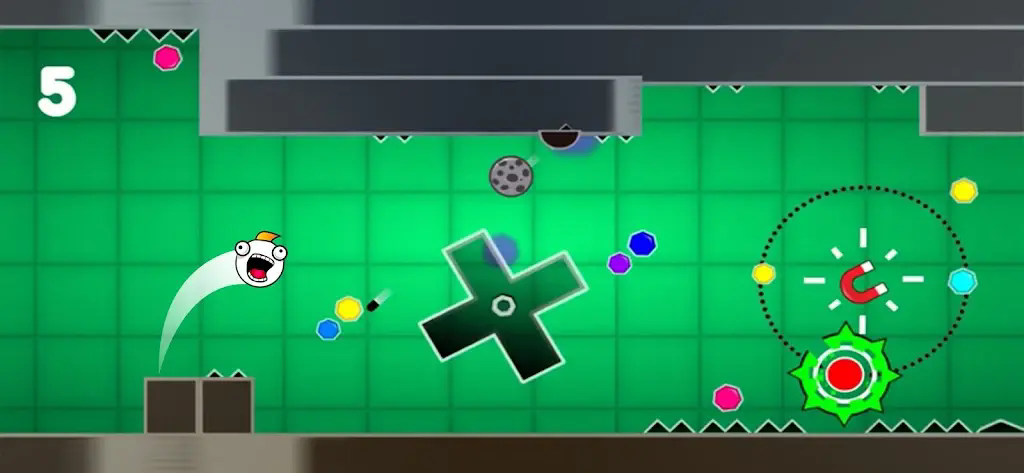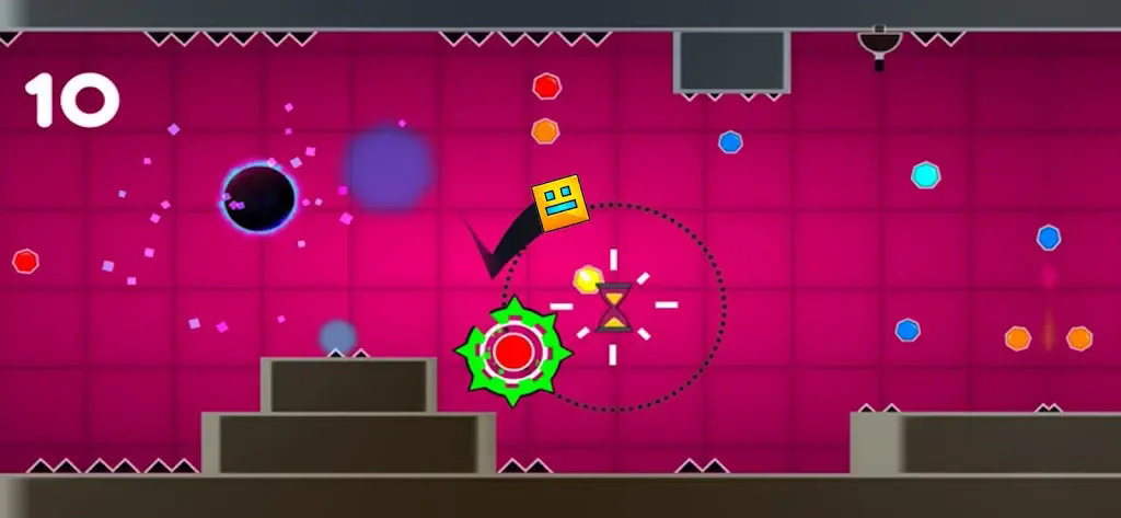 1、操控角色奔跑:通过滑动屏幕操控角色在几何赛道上奔跑,灵活运用跳跃、下滑等动作躲避障碍,收集沿途的金币与道具。